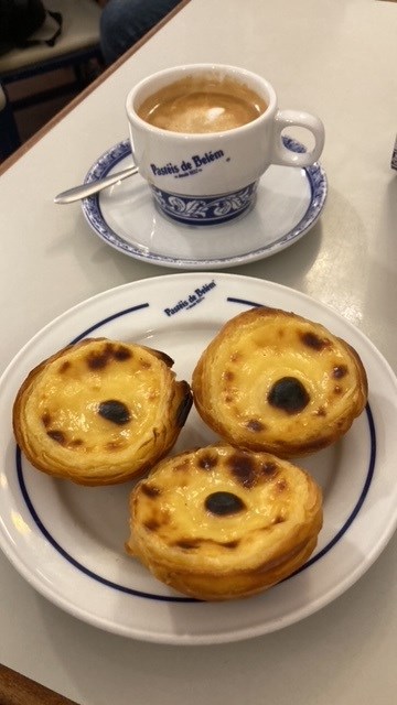 In de namiddag hebben we toch nog Belem bezocht, met zijn monumenten die zeker niet te vergeten zijn. We begonnen bij de Toren van Belem voor een fotostop en een paar honderd meter verder bij het Monument van de Ontdekkingsreiziger. Het is zeker de moeite waard om alle beelden op het monument goed te bekijken en op te merken dat er één vrouwelijk beeld tussen staat. Als laatste reden we nog naar de kerk van Jeronimos, eigenlijk maar 500 meter van elkaar verwijderd. Om elkaar niet te verliezen tussen de massa en ook een beetje uit veiligheid voor de zakkenrollers, vermijden we de trappen onder de weg door waar je snel slachtoffer kunt worden. In plaats daarvan rijden we met de autocar een paar kilometer, maar wel veilig in onze 'bubbel'! Het was zondag en in Belem is er dan vooral één plaats die het drukste van allemaal is en waar iedereen eigenlijk ook binnen wil komen, maar in groep lukt dat niet of het kost te veel tijd vanwege de lange rijen buiten bij de "pasteis de Belem". Onze gids regelt het bezoek aan de kerk en geeft de mensen daarna vrije tijd voor foto's en dergelijke. Dan lukt het haar om de rij over te slaan en bij een bevriende ober snel de nodige pasteis te halen en in de autocar te serveren, nog lekker warm!