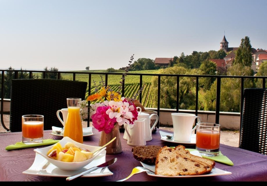 De maaltijden worden geserveerd in het restaurant met uitzicht op de weidse wijngaarden van de Elzasvlakte: ’s morgens een continentaal ontbijtbuffet en ’s avonds verzorgde 4-gangenmenu’s bediend aan tafel.