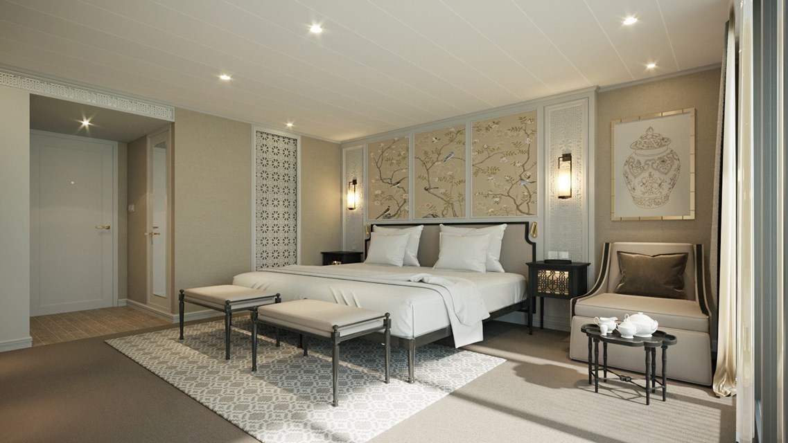 Het cruiseschip heeft ook vier uitzonderlijke suites (Suites Terrasse) op het bovendek en zonnedek (Celeste, Imperial, Jade en Mandarin), variërend in grootte van 85 m2 tot 105 m2, met terrassen van 16,8 m2 tot 18,5 m2 (uitgerust met ligstoelen, tafel en stoelen). Een privé lounge biedt u de mogelijkheid om in alle privacy te ontspannen.