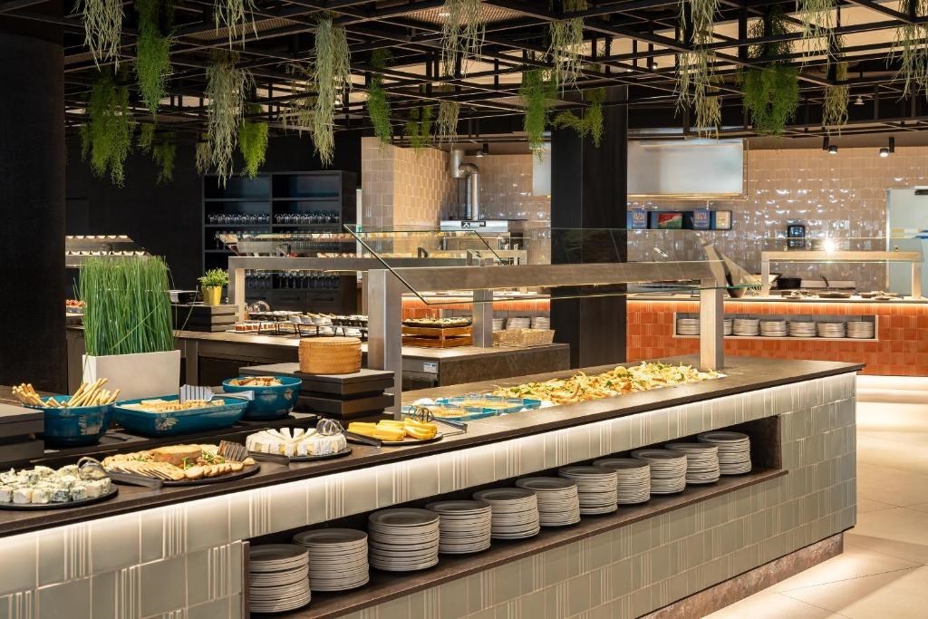 Rijkgevuld ontbijtbuffet. ’s Middags en 's avonds warme en koude gerechten in buffetvorm met showcooking.