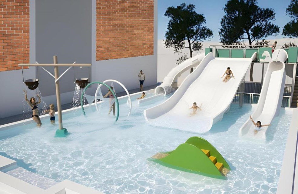 - buitenzwembaden met gloednieuwe waterspeelruimte met glijbanen