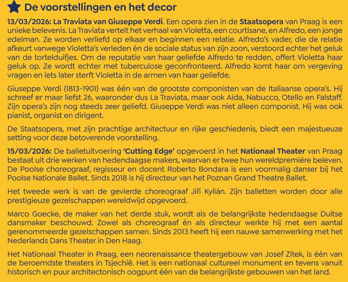We beginnen onze wandeling op het Wenceslasplein, het meest levendige plein van de stad. Hier werden de protestacties van zowel de Praagse Lente als de Fluwelen Revolutie gehouden. De oude stad vormt als het ware een doolhof van leuke straatjes rondom de oude markt. De enorme hoeveelheid geschiedenis die op en rond dit oude stadsplein bewaard gebleven is, is echt verwonderlijk. Vlak bij de kruidtoren bevindt zich het representatiehuis Obecní Dům, één van de mooiste en bekendste gebouwen van Praag waar nu onder andere concerten plaatsvinden. Vroeger stond hier het paleis van de Boheemse koningen. Nu is het een art-nouveaugebouw én een ware streling voor het oog. Het representatiehuis wordt gezien als het mooiste voorbeeld van jugendstilarchitectuur in Praag. Dineren doen we in het restaurant Pivnice Obecní Dům. ’s Avonds genieten we in de Staatsopera van de prachtige opera La Traviata van Giuseppe Verdi. Het libretto van Francesco Maria Piave is gebaseerd op de roman ‘La dame aux camélias’. Deze roman werd in 1848 geschreven door Alexandre Dumas (zoon van de bekendere gelijknamige Alexandre Dumas).