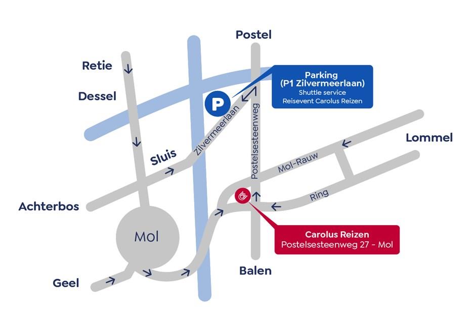 Kom je met de auto? Dan kan je parkeren op PARKING 1 van het Zilvermeer. Een shuttledienst brengt je doorlopend van en naar het reiscafé.