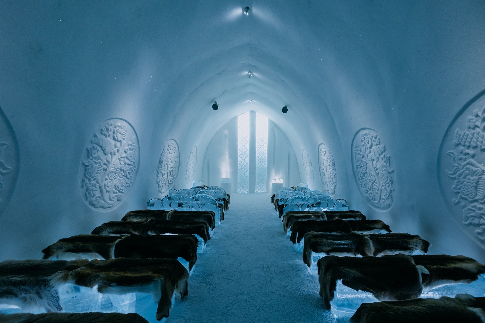 De reis voert verder naar het Muddus Nationaalpark, onderdeel van het Laponia-werelderfgoedgebied. Dit beschermde natuurgebied staat bekend om zijn stille oerbossen, kloven en moerassen, een paradijs voor natuurliefhebbers. In Gällivare, een stad die groot werd door de ijzerertswinning, zien we hoe de rijkdom van de bodem het leven in het noorden mee vormgaf. Hier bewonderen we ook een bijzondere houten Sami-kerk, prachtig gelegen en gebouwd in traditionele stijl, een stille getuige van de religieuze en culturele geschiedenis van de regio. Vervolgens brengen we een bezoek aan het wereldberoemde ijshotel van Jukkasjärvi. Zelfs buiten het winterseizoen is het een fascinerende plek: met kunstig gesneden ijs, innovatieve architectuur en een magische sfeer die je nergens anders vindt. In Kiruna brengen we een bezoek aan een ijzerertsmijn. We sluiten de dag af met een diner en overnachting.